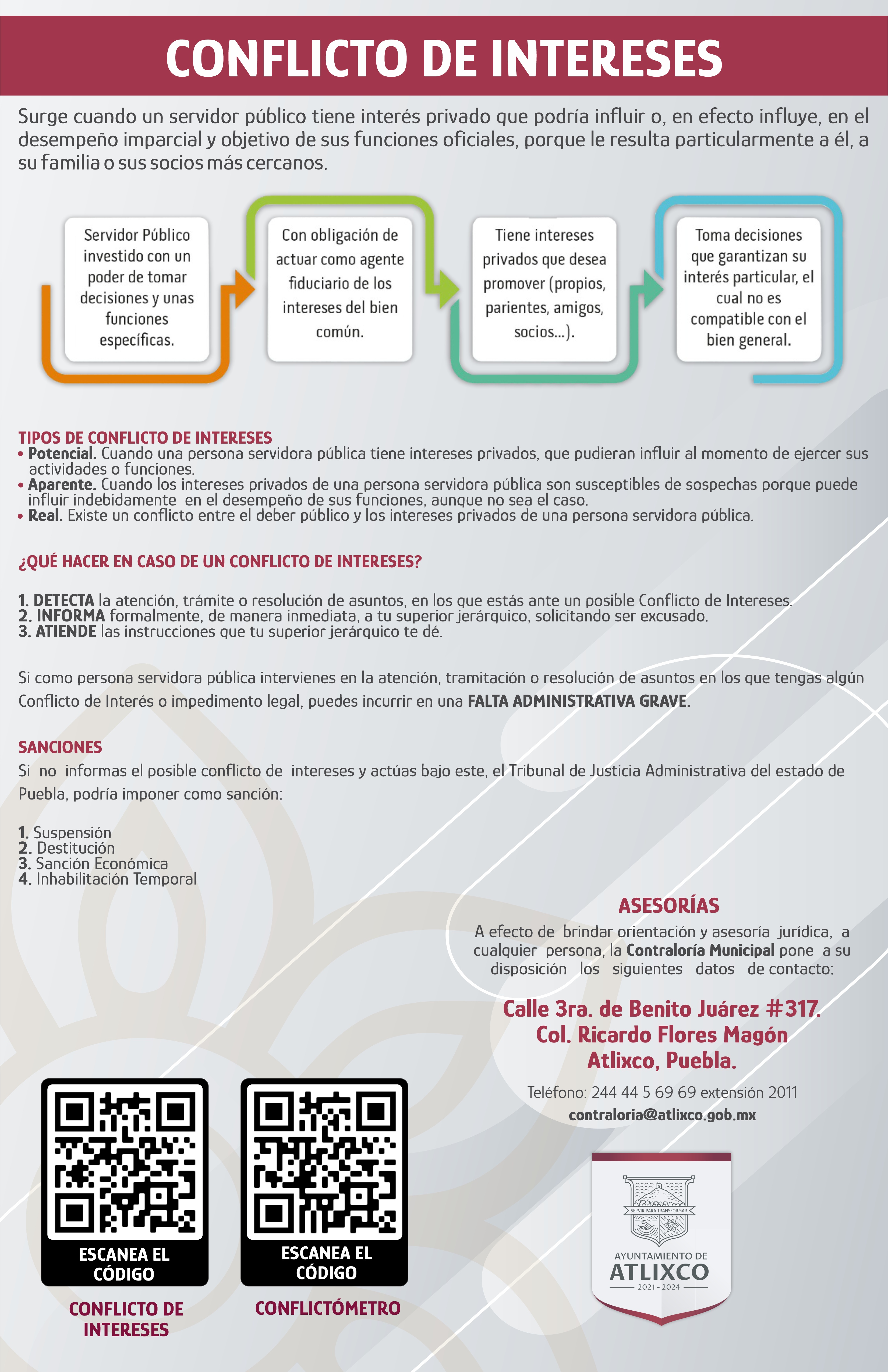 Con el objeto de establecer el protocolo de actuación que se debe observar ante un posible Conflicto de Intereses, el Comité de Ética e Integridad del Honorable Ayuntamiento de Atlixco, Puebla, pone a su disposición: